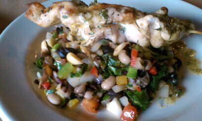 The food is not your traditional greasy spoon Americanized Greek. Instead, the items are as locally sourced and as organic as possible with a Crete influence. The beef, chicken and lamb are raised humanely and without the use of hormones or antibiotics. Menu items are served single plate style and are good for sharing. Tonight's fare included chicken kabob served on a bed of seasonal vegetable saute with black and lima beans, wild rice sauted with spinach, lemon and dill and baby eggplant stuffed with vegetables finished with tomato sauce and feta. The only downside is that the food can take a long time but it's worth the wait as it is absolutely amazing.